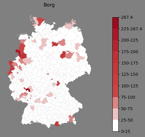 Relative Verteilung des Namens Borg (1996)Direkt zur Karte Die Farbskala zeigt die Anzahl von "Borg" bezogen auf je 1 Million Einträge. |
