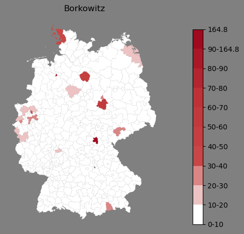 Absolute Verteilung des Namens Borkowitz (1890)Direkt zur Karte Absolute Verteilung des Namens "Borkowitz" um 1890 im damaligen Deutschen Reich Sie können die Karte innerhalb des Fensters zoomen und verschieben. |