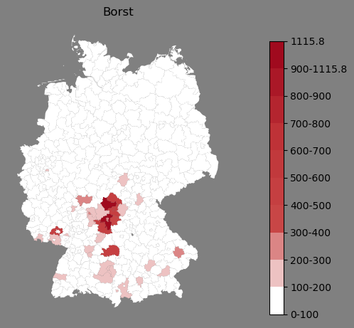 Absolute Verteilung des Namens Borst (1890)Direkt zur Karte Absolute Verteilung des Namens "Borst" um 1890 im damaligen Deutschen Reich Sie können die Karte innerhalb des Fensters zoomen und verschieben. |