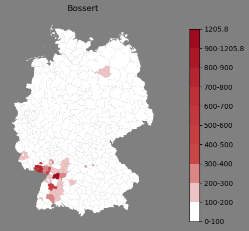 Relative Verteilung des Namens Bossert (1996)Direkt zur Karte Die Farbskala zeigt die Anzahl von "Bossert" bezogen auf je 1 Million Einträge. |