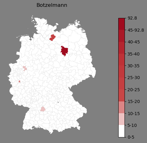 Relative Verteilung des Namens Botzelmann (1996)Direkt zur Karte Die Farbskala zeigt die Anzahl von "Botzelmann" bezogen auf je 1 Million Einträge. |