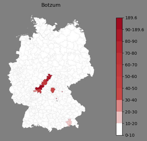 Absolute Verteilung des Namens Botzum (1890)Direkt zur Karte Absolute Verteilung des Namens "Botzum" um 1890 im damaligen Deutschen Reich Sie können die Karte innerhalb des Fensters zoomen und verschieben. |