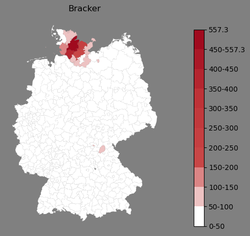 Relative Verteilung des Namens Bracker (1996)Direkt zur Karte Die Farbskala zeigt die Anzahl von "Bracker" bezogen auf je 1 Million Einträge. |