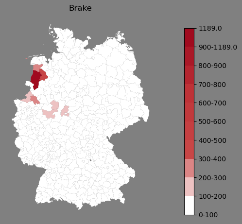 Relative Verteilung des Namens Brake (1996)Direkt zur Karte Die Farbskala zeigt die Anzahl von "Brake" bezogen auf je 1 Million Einträge. |