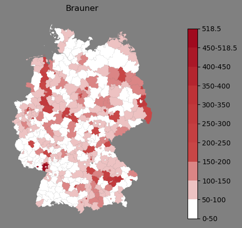 Relative Verteilung des Namens Brauner (1996)Direkt zur Karte Die Farbskala zeigt die Anzahl von "Brauner" bezogen auf je 1 Million Einträge. |