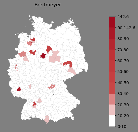 Absolute Verteilung des Namens Breitmeyer (1890)Direkt zur Karte Absolute Verteilung des Namens "Breitmeyer" um 1890 im damaligen Deutschen Reich Sie können die Karte innerhalb des Fensters zoomen und verschieben. |