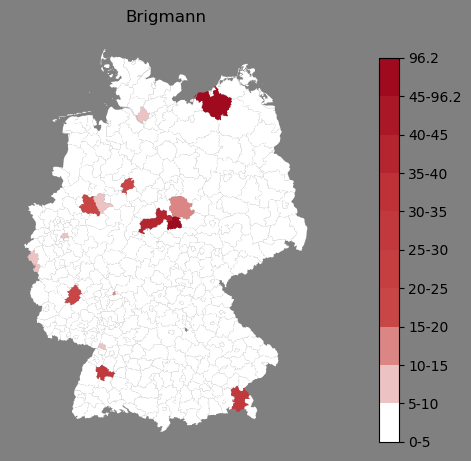 Relative Verteilung des Namens Brigmann (1996)Direkt zur Karte Die Farbskala zeigt die Anzahl von "Brigmann" bezogen auf je 1 Million Einträge. |