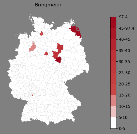 Absolute Verteilung des Namens Bringmeier (1890)Direkt zur Karte Absolute Verteilung des Namens "Bringmeier" um 1890 im damaligen Deutschen Reich Sie können die Karte innerhalb des Fensters zoomen und verschieben. |