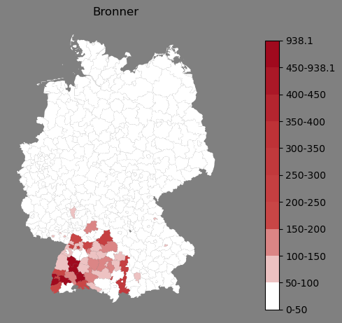 Relative Verteilung des Namens Bronner (1996)Direkt zur Karte Die Farbskala zeigt die Anzahl von "Bronner" bezogen auf je 1 Million Einträge. |