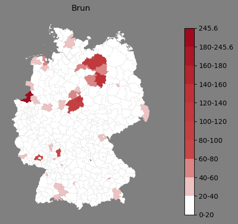 Relative Verteilung des Namens Brun (1996)Direkt zur Karte Die Farbskala zeigt die Anzahl von "Brun" bezogen auf je 1 Million Einträge. |
