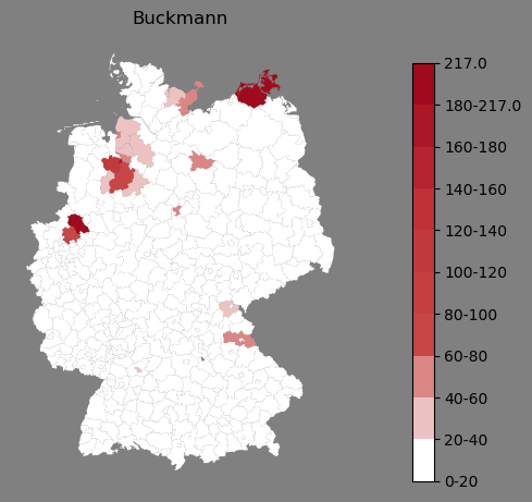 Relative Verteilung des Namens Buckmann (1996)Direkt zur Karte Die Farbskala zeigt die Anzahl von "Buckmann" bezogen auf je 1 Million Einträge. |