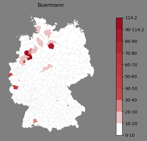 Relative Verteilung des Namens Buermann (1996)Direkt zur Karte Die Farbskala zeigt die Anzahl von "Buermann" bezogen auf je 1 Million Einträge. |