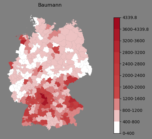 Absolute Verteilung des Namens Baumann (1890)Direkt zur Karte Absolute Verteilung des Namens "Baumann" um 1890 im damaligen Deutschen Reich Sie können die Karte innerhalb des Fensters zoomen und verschieben. |