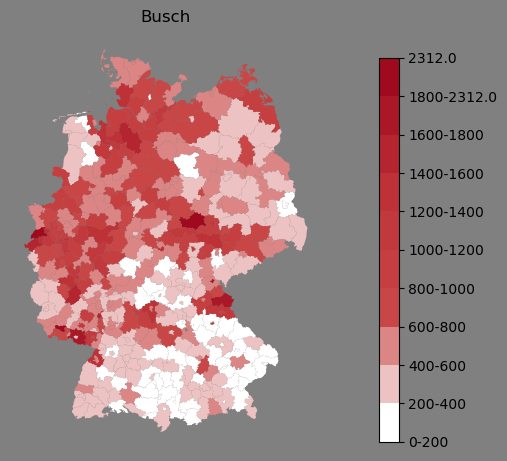 Absolute Verteilung des Namens Busch (1890)Direkt zur Karte Absolute Verteilung des Namens "Busch" um 1890 im damaligen Deutschen Reich Sie können die Karte innerhalb des Fensters zoomen und verschieben. |