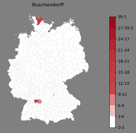 Relative Verteilung des Namens Buschendorff (1996)Direkt zur Karte Die Farbskala zeigt die Anzahl von "Buschendorff" bezogen auf je 1 Million Einträge. |