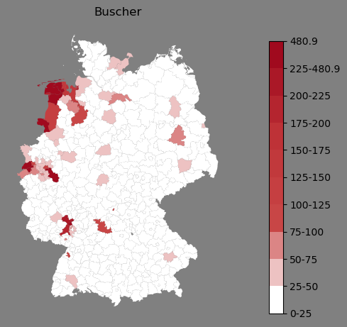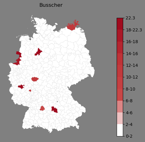 Relative Verteilung des Namens Buscher (1996)Direkt zur Karte Die Farbskala zeigt die Anzahl von "Buscher" bezogen auf je 1 Million Einträge. |