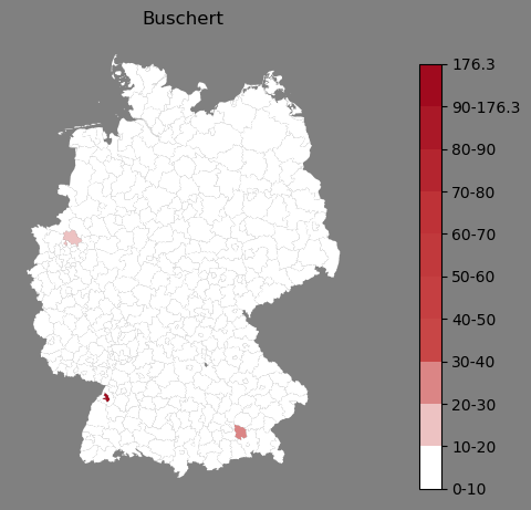 Relative Verteilung des Namens Buschert (1996)Direkt zur Karte Die Farbskala zeigt die Anzahl von "Buschert" bezogen auf je 1 Million Einträge. |