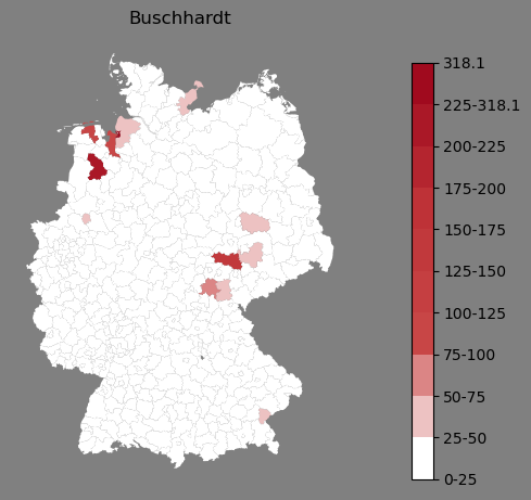 Relative Verteilung des Namens Buschhardt (1996)Direkt zur Karte Die Farbskala zeigt die Anzahl von "Buschhardt" bezogen auf je 1 Million Einträge. |
