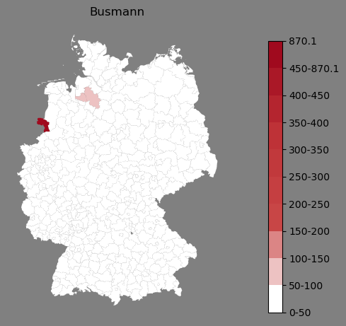 Relative Verteilung des Namens Busmann (1996)Direkt zur Karte Die Farbskala zeigt die Anzahl von "Busmann" bezogen auf je 1 Million Einträge. |