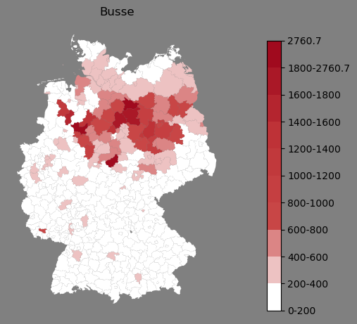 Relative Verteilung des Namens Busse (1996)Direkt zur Karte Die Farbskala zeigt die Anzahl von "Busse" bezogen auf je 1 Million Einträge. |