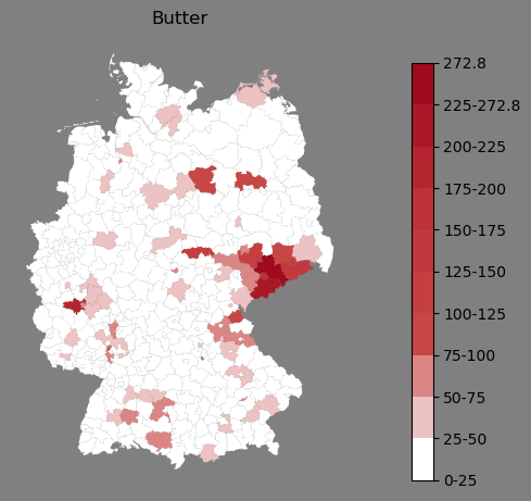 Absolute Verteilung des Namens Butter (1890)Direkt zur Karte Absolute Verteilung des Namens "Butter" um 1890 im damaligen Deutschen Reich Sie können die Karte innerhalb des Fensters zoomen und verschieben. |