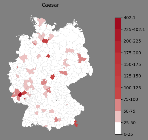 Relative Verteilung des Namens Caesar (1996)Direkt zur Karte Die Farbskala zeigt die Anzahl von "Caesar" bezogen auf je 1 Million Einträge. |