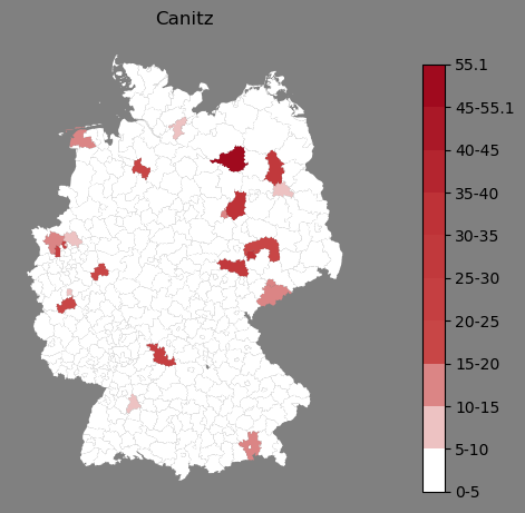 Relative Verteilung des Namens Canitz (1996)Direkt zur Karte Die Farbskala zeigt die Anzahl von "Canitz" bezogen auf je 1 Million Einträge. |
