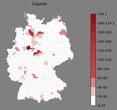 Absolute Verteilung des Namens Capelle (1890)Direkt zur Karte Absolute Verteilung des Namens "Capelle" um 1890 im damaligen Deutschen Reich Sie können die Karte innerhalb des Fensters zoomen und verschieben. |