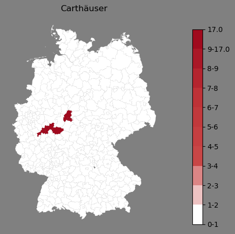 Absolute Verteilung des Namens Carthäuser (1890)Direkt zur Karte Absolute Verteilung des Namens "Carthäuser" um 1890 im damaligen Deutschen Reich Sie können die Karte innerhalb des Fensters zoomen und verschieben. |