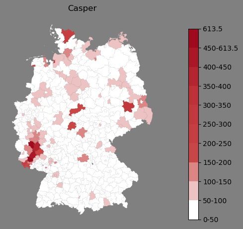 Relative Verteilung des Namens Casper (1996)Direkt zur Karte Die Farbskala zeigt die Anzahl von "Casper" bezogen auf je 1 Million Einträge. |