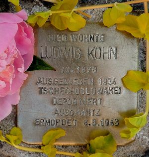 - Hier wohnte Ludwig Kohn, Jg. 1878, ausgewiesen 1934, Tschechoslowakei, deportiert. Auschwitz. ermordet 8.6.1943