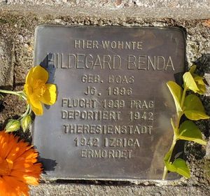 - Hier wohnte, Hildegard Benda, geb. Boas, Jg. 1896, Flucht 1939 Prag, deportiert 1942, Theresienstadt, 1942 Izbica, ermordet