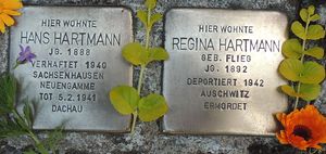 - Hier wohnte, Regina Hartmann, geb. Flieg, Jg.1892, deportiert 1942, Auschwitz, ermordet