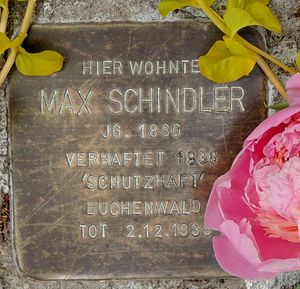 - Hier wohnte, Max Schindler, Jg 1880, verhaftet 1938, "Schutzhaft", Buchenwald, TOT 2.12.1938