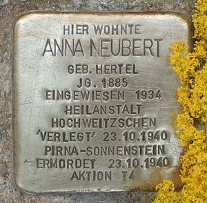 - Hier wohnte, Anna Neubert geb. Hertel, Jg 1885, eingewiesen 1934, Heilanstalt Hochweitzschen, "verlegt" 23.10.1940, Pirna-Sonnenstein, ermordet 23.10.1940, Aktion T4