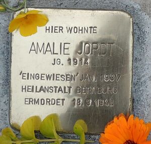 - Hier wohnte, Amalie Jordt, Jg. 1914, "eingewiesen" Jan. 1937, Heilanstalt Bernburg, ermordet 18.3.1942