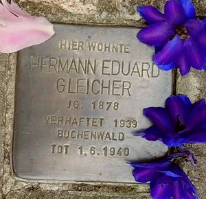 - Hier wohnte, Hermann Eduard Gleicher, Jg. 1878, verhaftet 1939, Buchenwald, TOT 1.6.1940