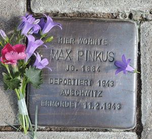 - Hier wohnte, Max Pinkus, Jg. 1884, deportiert 1943, Auschwitz, ermordet 11.2.1943