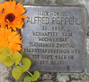 - Hier wohnte, Alfred Pepperl, Jg. 1907, verhaftet 1934, "Hochverrat", Zuchthaus Zwickau, 1943 Strafdivision 999, tot Sept. 1944 in der Ägäis