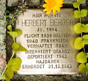 - Hier wohnte, Herbert Berger, Jg. 1894, Flucht 1939 Belgien, 1940 Frankreich, verhaftet 1940, interniert Drancy, deportiert 1943, Majdanek, ermordet 31.12.1943