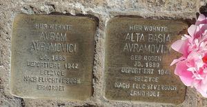 - Hier wohnte Alta Basia Avramovici, geb. Rosen, Jg 1889, deportiert 1942, Belzyce, nach Fluchtversuch, ermordet