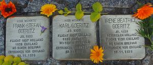 - Hier wohnte, Frank-Stefan Goeritz, Jg. 1932, Flucht 1937 Holland, 1939 England, MS Simon Bolivar, ertrunken vor England, 18.11.1939