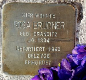 - Hier wohnte, Rosa Brudner, geb. Granditz, Jg. 1884, deportiert 1942, Belzyce, ermordet