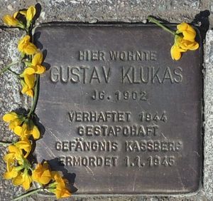 - Hier wohnte Gustav Klukas, Jg. 1902, verhaftet 1944, Gestapohaft, Gefängnis Kasberg, ermordet 1.1.1945