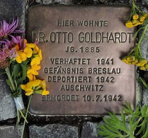 - Hier wohnte, Dr. Otto Goldhardt, Jg. 1885, verhaftet 1941, Gefängnis Breslau, deportiert 1942, Auschitz, ermordet 10.7.1942