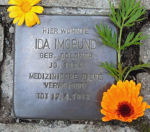 - Hier wohnte Ida Imgrund, geb. Goldner, Jg. 1884, medizinische Hilfe, verweigert, tot 17.4.1942