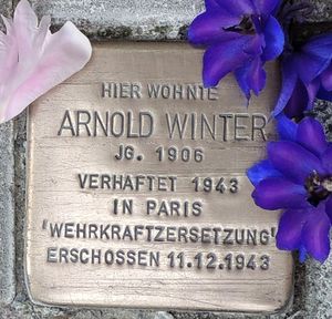 - Hier wohnte, Arnold Winter, Jg. 1906, verhaftet 1943, in Paris, 'Wehrkraftzersetzung', erschossen 11.12.1943