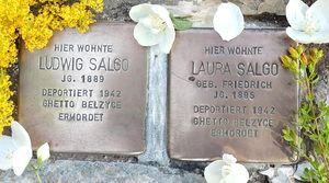 - Hier wohnte, Ludwig Salgo, Jg. 1889, deportiert 1942, Ghetto Belzyce, ermordet