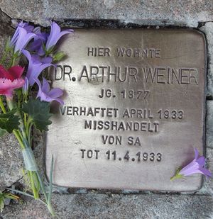 - Hier wohnte, Dr. Arthur Weiner, Jg. 1877, verhaftet April 1933, misshandelt, von SA, tot 11.4.1933