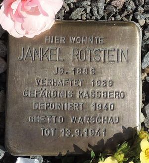 - Hier wohnte, Jankel Rotstein, Jg 1889, verhaftet 1939, Gefängnis Kasberg, deportiert 1940, Ghetto Warschau, tot 13.9.1941
